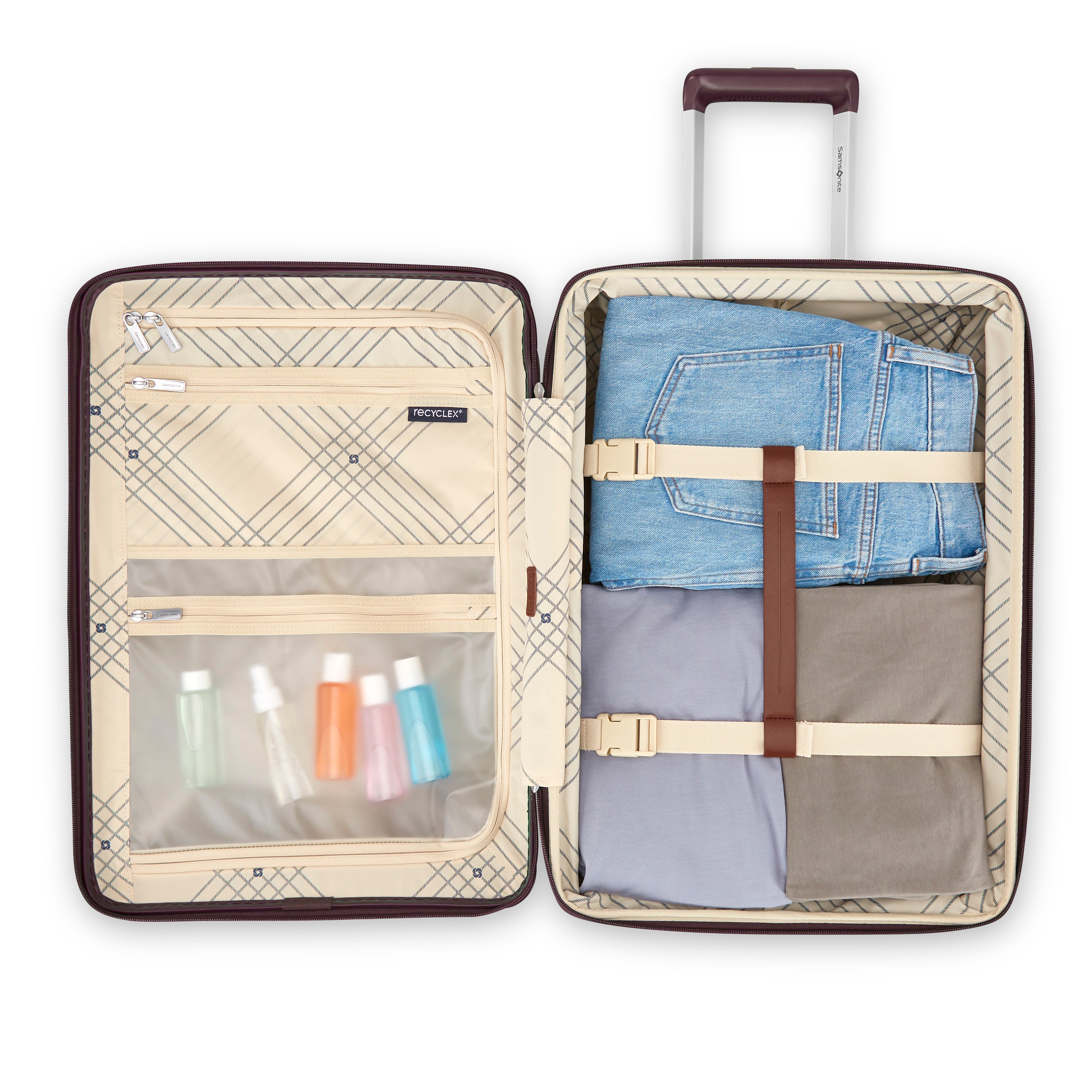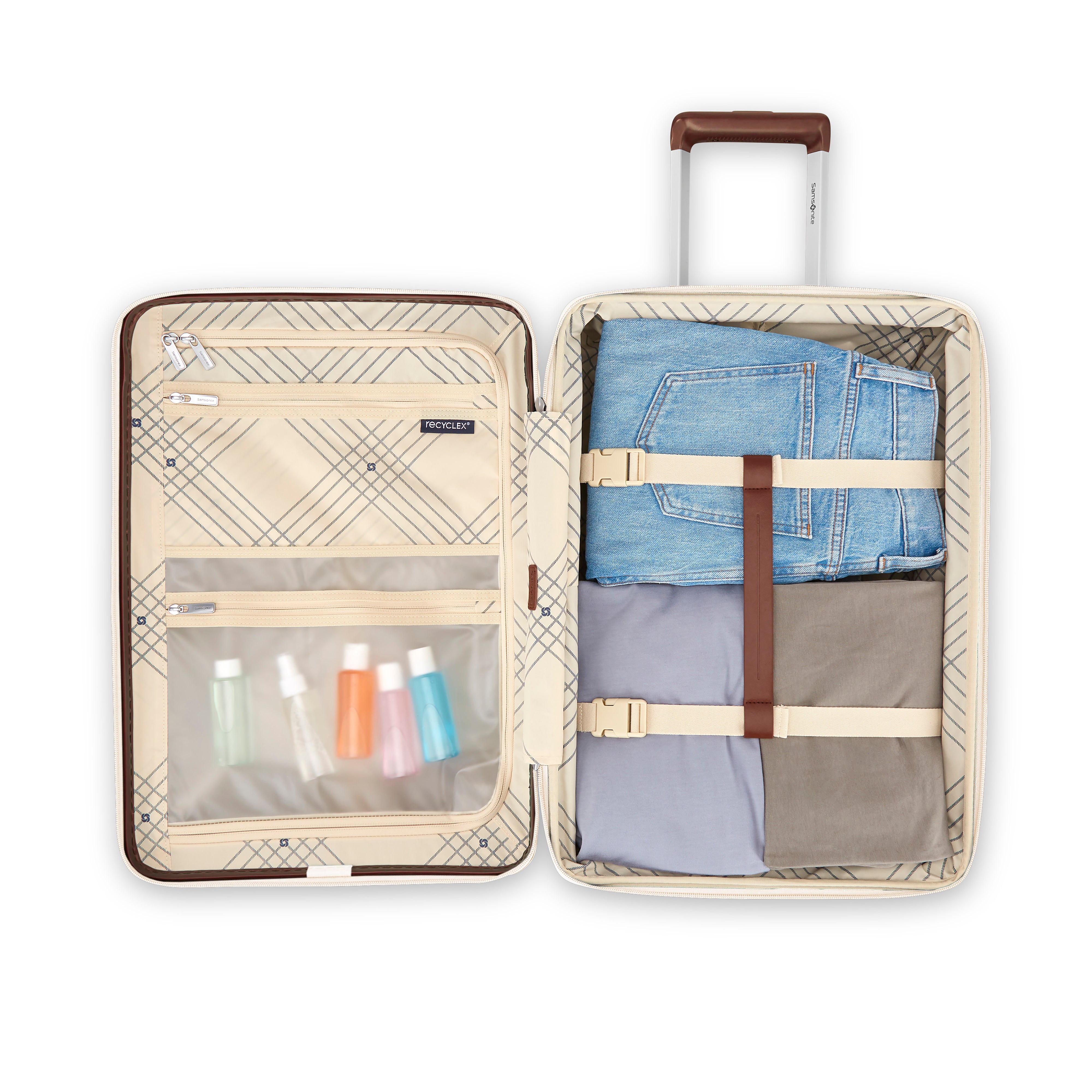 - Exterior fabric of the softside items is made from a blend of cotton and material created using 100% post-consumer recyclex PET bottles
